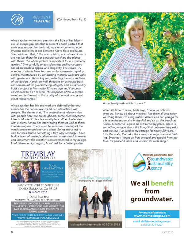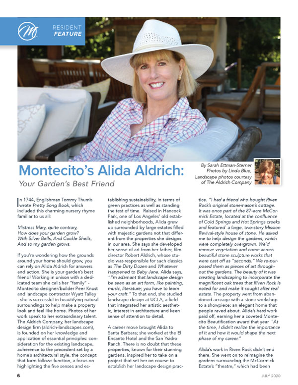 Since first launching her landscape design career in 1982 in Los Angeles, Alida Aldrich has stayed true to three pillars of her craft: respect for a site’s existing landscape; careful consideration of surrounding architecture; and above all, a loyalty to client vision. Throughout Santa Barbara and Montecito — where she relocated her headquarters in 1996 — The Aldrich Company’s time-tested approach is well-suited to the region’s picturesque parcels, architectural review, and homeowners’ sophisticated and discerning taste. And it shows. Aldrich has won design awards from the Montecito Association, Santa Barbara Beautiful, and — four years running — international “Best of Houzz” accolades. Her services include complete conceptual design, full working drawings, installation oversight, and maintenance supervision. For more, visit her site: http://www.aldrich-landscapes.com